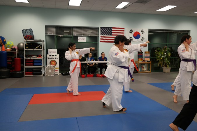 Combinations up to your belt rank. Work once through the combinations slowly. Ensure that each stance and position in the combination is correct. Say the moves as you go through the combinations, then try a second time with speed.