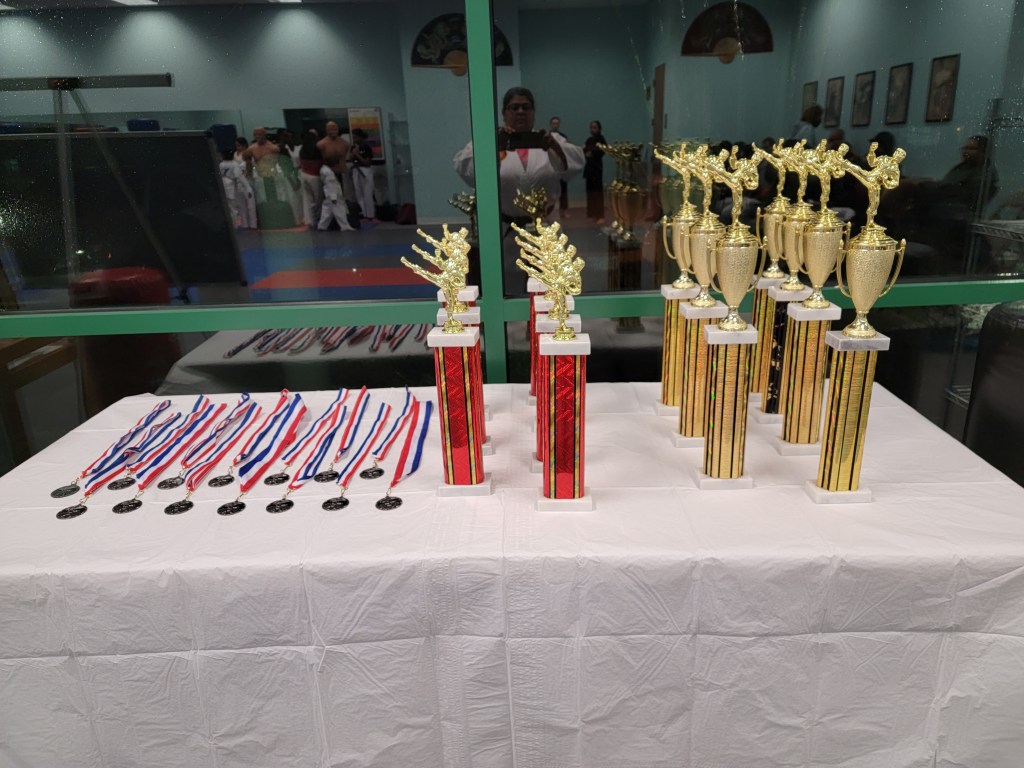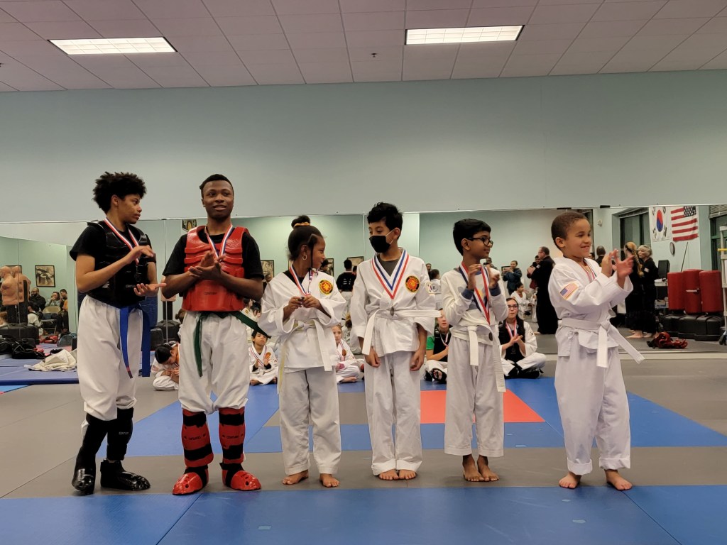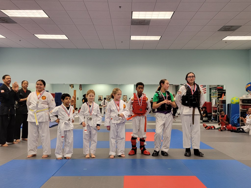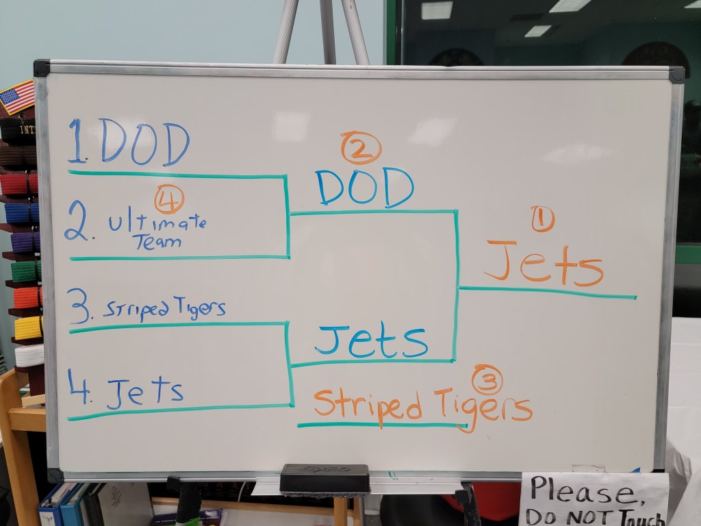 Our sparring tournament was super exciting. Four teams featuring combinations of Beginner, Intermediate and Advanced belts competed for trophies and medals.