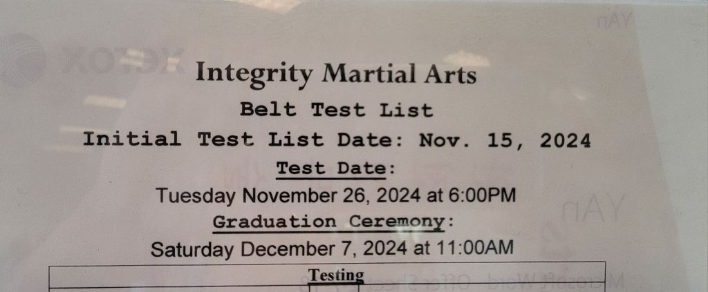 November belt test is Tuesday, November 26th at 6pm.  Full uniform, please.  Intermediate and advanced belts must bring sparring gear.